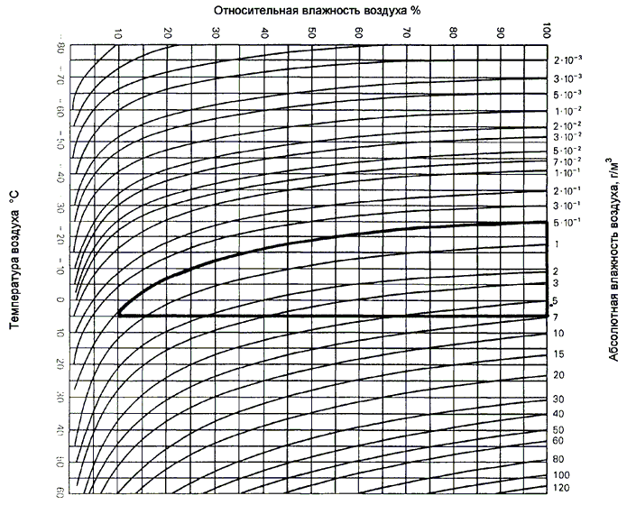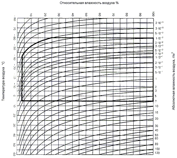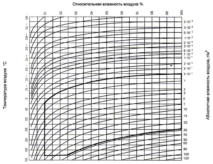 Промежуточное значение относительной влажности воздуха при определенном значении температуры воздуха в пределах температурного диапазона класса может быть определено как точка, в которой кривая постоянной абсолютной влажности воздуха пересекается с прямыми линиями температуры и относительной влажности воздуха соответственно.