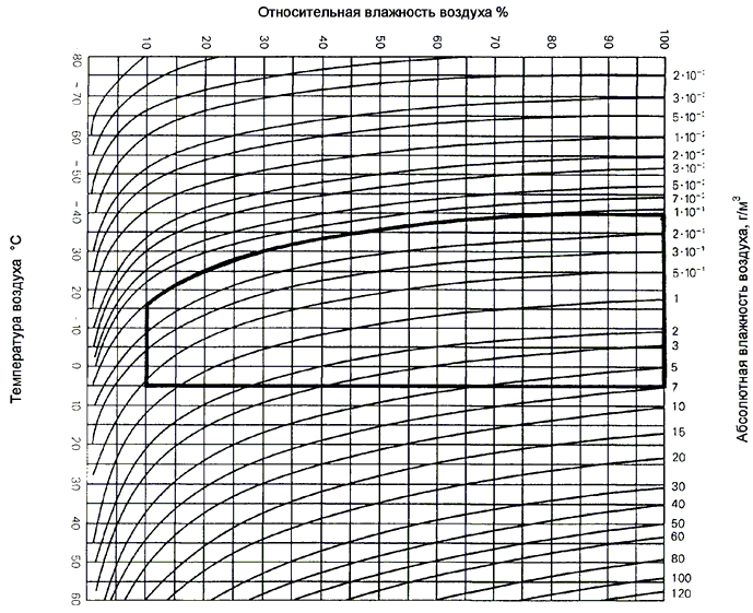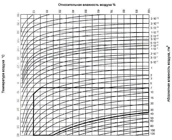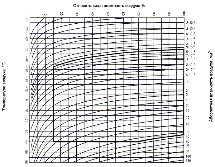 Применяя этот метод, можно найти любую другую комбинацию внутри класса, например, для класса AB6 при установленном для него предельном значении максимальной температуры воздуха 60°C получаем значение относительной влажности 27%.