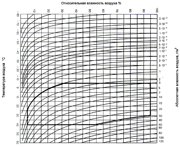 Должно быть выбрано изделие, предназначенное для условий установки, определяемых классом AB6. Для нахождения относительной влажности, которую изделие должно выдержать, например, при 40°C, следует двигаться по вертикальной линии для температуры 40°C на климатограмме для класса AB6 до точки, в которой эта линия пересекается с кривой для 35 г/м3 абсолютной влажности воздуха, которая является предельным значением максимальной абсолютной влажности этого класса. Прочертив горизонтальную линию от этой точки до шкалы относительной влажности воздуха, получим значение 67% относительной влажности воздуха.