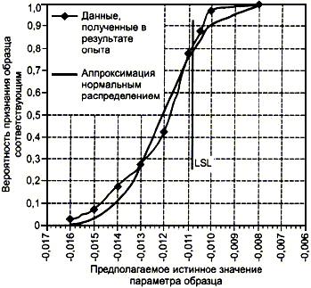 Функции распределения вероятности признания образцов соответствующими и аппроксимирующего нормального распределения можно отобразить графически с помощью диаграммы MS Excel.