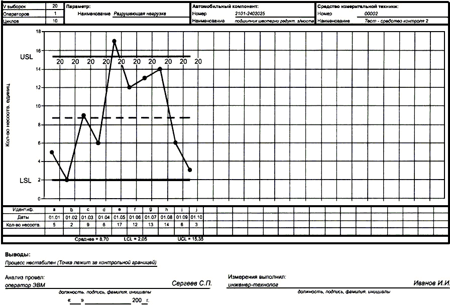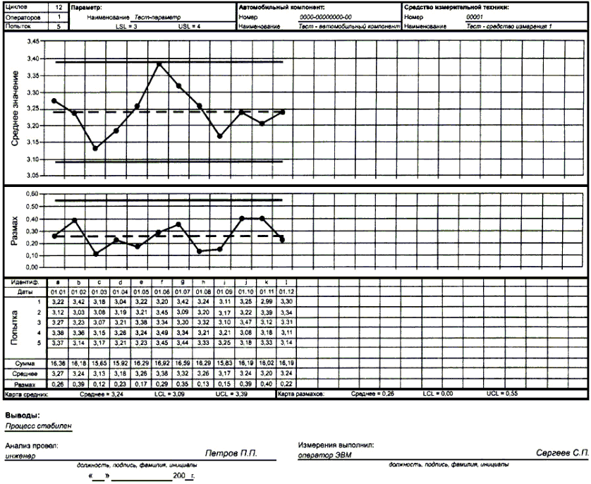 Примечание. Стабильность измерительного процесса отражается на контрольной карте отсутствием точек за контрольными границами, трендов, неслучайного поведения в контрольных границах.