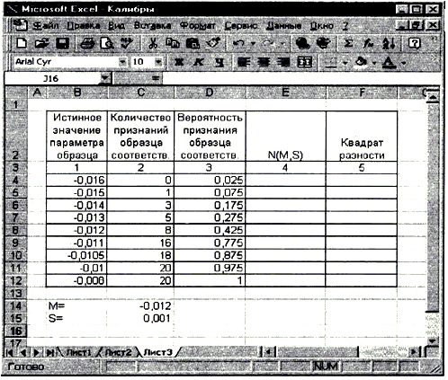 Отдельно от таблицы результатов контроля на лист MS Excel заносят приближенные значения параметров и нормального распределения (см. рисунок Н.1), аппроксимирующего распределение вероятности признания образцов соответствующими.