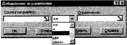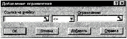 В поле ввода "Ограничения:" вводят дополнительное ограничение. Для этого необходимо нажать кнопку "Добавить" справа от поля ввода "Ограничения", после чего на экране отобразится диалоговое окно "Добавление ограничения" (рисунок Н.6).