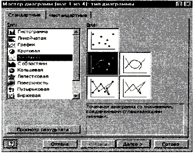 В диалоговом окне "Мастер диаграмм" следует выбрать тип диаграммы "Точечная" и вид "Точечная диаграмма со значениями, соединенными сглаживающими линиями" (см. рисунок Н.10).