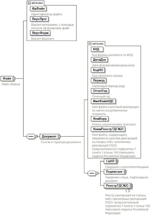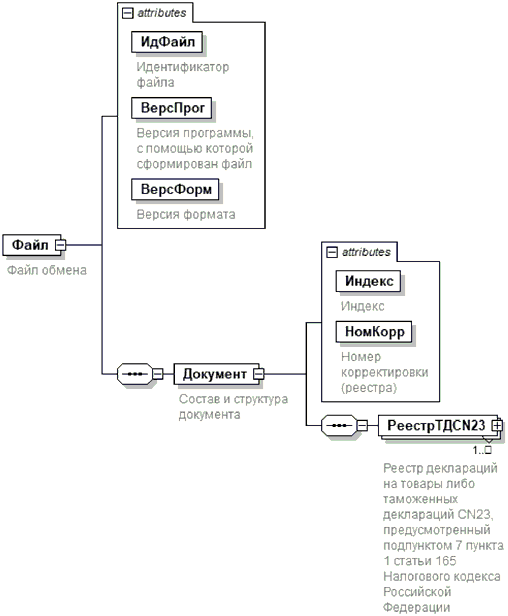 | Реестр деклараций на товары либо таможенных деклараций CN 23, предусмотренный подпунктом 7 пункта 1 статьи 165 Налогового кодекса Российской Федерации | РеестрТДСN 23 | С | ОМ | Состав элемента представлен в таблице 5.3 |