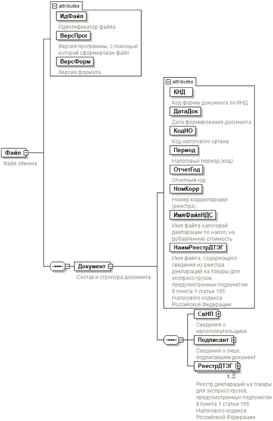 | Имя файла, содержащего сведения из реестра деклараций на товары для экспресс-грузов, предусмотренных подпунктом 8 пункта 1 статьи 165 Налогового кодекса Российской Федерации | НаимРеестрДТЭГ | А | T(1-255) | О | Содержит (повторяет) имя файла (с расширением) с префиксом KO_RRDTEG.2 |