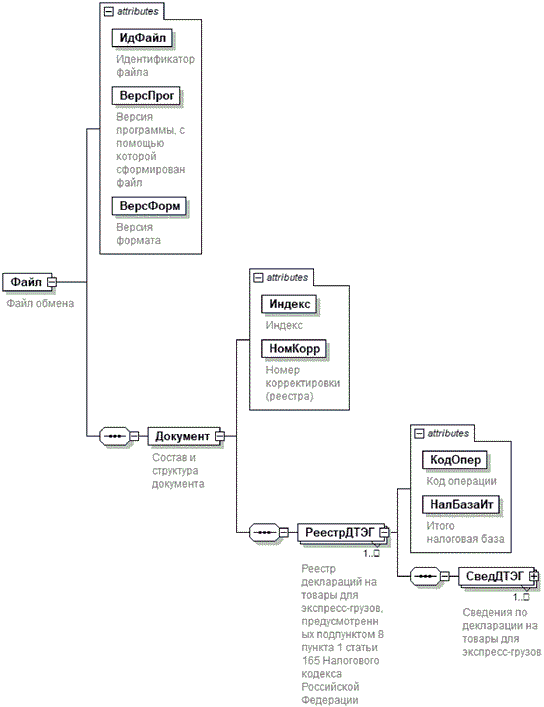 | Реестр деклараций на товары для экспресс-грузов, предусмотренных подпунктом 8 пункта 1 статьи 165 Налогового кодекса Российской Федерации | РеестрДТЭГ | С | ОМ | Состав элемента представлен в таблице 5.3 |