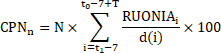 - значение ставки RUONIA на дату i, публикуемое на официальном сайте Банка России в информационно-коммуникационной сети "Интернет". В случае отсутствия опубликованного значения ставки RUONIA за i-ый день (в том числе, если i-ый день является выходным или праздничным днем в Российской Федерации), значение ставки принимается равным последнему опубликованному значению. Значение каждой ставки определяется с точностью до двух знаков после запятой в соответствии с правилами математического округления.
