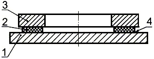 1 - поверочная плита по ГОСТ 10905 не ниже 2-го класса точности; 2 - фрикционная накладка; 3 - нажимное кольцо из стали по ГОСТ 1050, твердость ; 4 - зона контроля отклонений от плоскостности (по всей длине окружности)