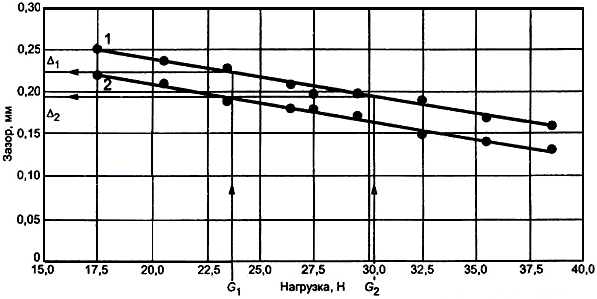 На рисунке А.2 приведены результаты исследования зависимости зазора от значений усилий G для двух образцов накладок (1 и 2).
