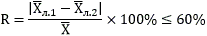 допускаемое расхождение между результатами испытаний, проводимых в двух разных лабораториях, при Р=0,95 не должно превышать 60% по отношению к среднему арифметическому значению (см. также А.5.4.2 - норматив межлабораторной воспроизводимости R).