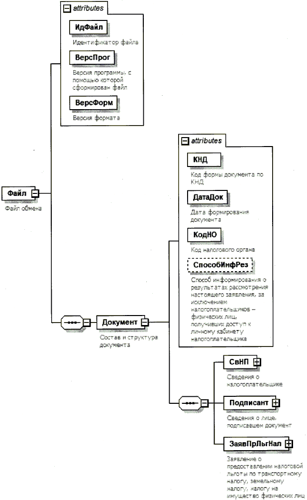 | Заявление о предоставлении налоговой льготы по транспортному налогу, земельному налогу, налогу на имущество физических лиц | ЗаявПрЛьгНал | С | О | Состав элемента представлен в таблице 4.9 | |