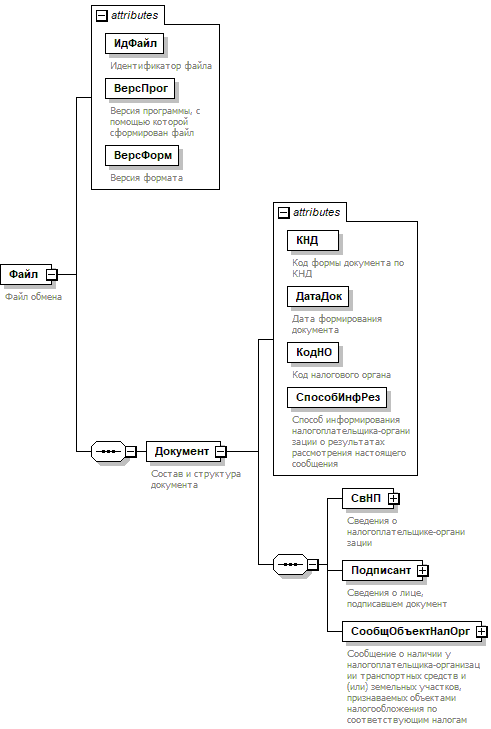 Сообщение о наличии у налогоплательщика-организации транспортных средств и (или) земельных участков, признаваемых объектами налогообложения по соответствующим налогам (СообщОбъектНалОрг)