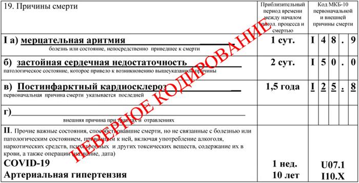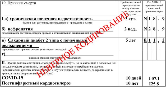В примере записана правильная логическая последовательность: состояние, записанное на нижней строке части 1 свидетельства, явилось причиной возникновения всех состояний, записанных выше. В соответствии с правилом МКБ-10 ("Общий принцип" или шаг SP3) первоначальная причина смерти располагается на нижней заполненной строке - в). В свидетельстве прокодированы все записанные состояния, первоначальная причина смерти подчеркнута. Указание наличия положительного теста на COVID-19 не обязательно.