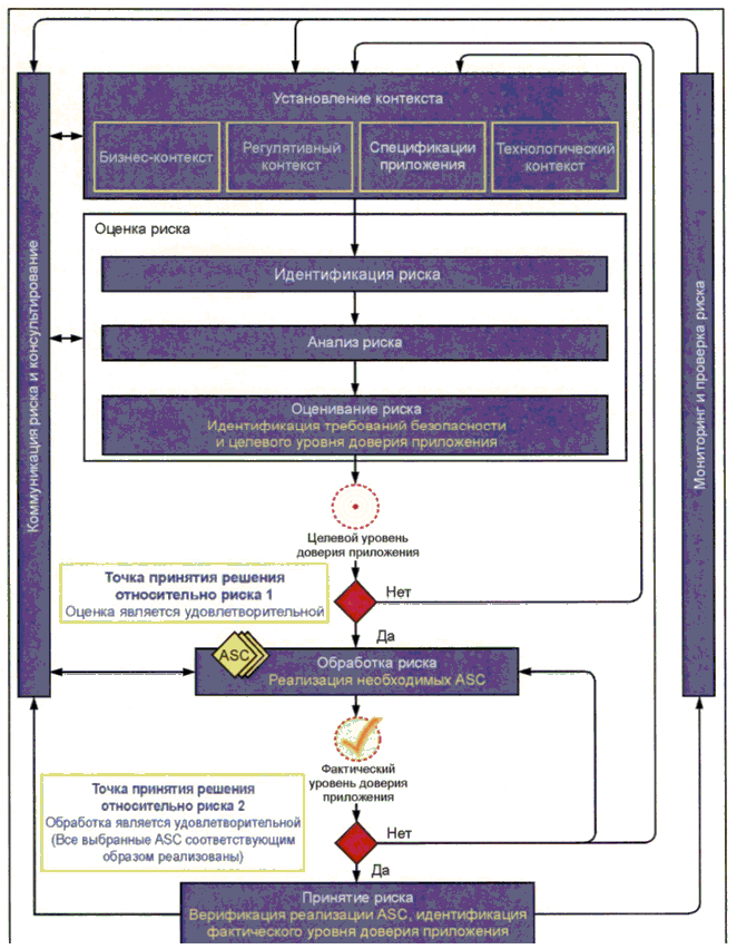 Выполняются следующие элементы процесса. Сначала устанавливается контекст приложения. Затем проводится оценка риска на уровне приложений. Если это предоставляет достаточно информации для эффективного определения мер и средств контроля и управления, которые необходимы для уменьшения рисков из-за использования организацией данного приложения до степени, допустимой (или приемлемой) для владельца приложения, то задача завершена, и следует обработка риска. Если информации недостаточно, будет проводиться другая итерация оценки риска с пересмотренными критериями риска и средой приложения (например, бизнес-контекст, регулятивный и технологический контексты, спецификации приложения, критерии оценивания риска, критерии принятия риска, критерии воздействия и т.д.), возможно, для ограниченных частей в пределах приложения.