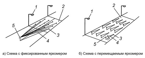 Для проведения измерений по схеме с фиксированным положением яркомера [рисунок 1а)] используют яркомер, угловая апертура которого составляет не более двух угловых минут в вертикальной плоскости и 20 угловых минут в горизонтальной плоскости. Яркомер устанавливают в положение, соответствующее положению наблюдателя, и, нацеливаясь поочередно на каждую точку контрольного поля, проводят отсчет показаний.