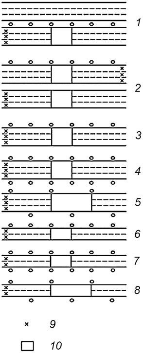 1 - шестиполосная дорога с центральной разделительной полосой при двойном центральным расположении светильников; 2 - шестиполосная дорога с центральной разделительной полосой при одностороннем однорядном расположении светильников; 3 - трехполосная дорога при одностороннем однорядном расположении светильников; 4 - трехполосная дорога при двухстороннем прямоугольном расположении светильников; 5 - трехполосная дорога при двухстороннем шахматном расположении светильников; 6 - двухполосная дорога при одностороннем однорядном расположении светильников; 7 - двухполосная дорога при двухстороннем прямоугольном расположении светильников; 8 - двухполосная дорога при двухстороннем шахматном расположении светильников; 9 - расположение наблюдателя; 10 - расположение контрольного участка