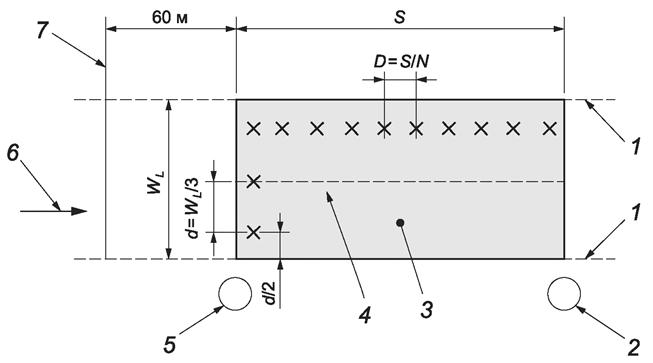1 - край дороги; 2 - последний светильник на контрольном участке; 3 - контрольный участок; 4 - центральная линия дороги; 5 - первый светильник на контрольном участке; 6 - направление измерений; 7 - расстояние от контрольного участка до измерительного прибора; x - точки измерения яркости (освещенности); - ширина полосы движения; d - расстояние между точками измерения в поперечном направлении; D - расстояние между точками измерения в продольном направлении; S - расстояние между светильниками; N - число точек измерения