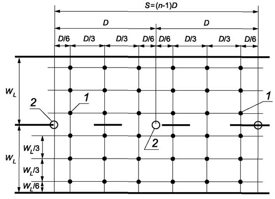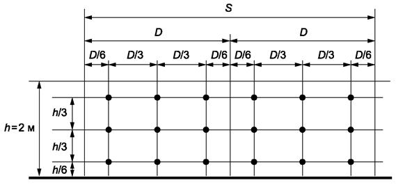 1 - точки измерения; 2 - осветительные приборы (ОП); S - длина контрольного участка (дорожного покрытия или стены); - ширина полосы движения; D - шаг ОП; n - число ОП в ряду на контрольном участке (показано для n = 3); h - размер контрольного участка стены по высоте