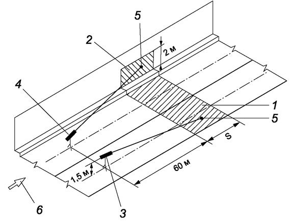 1 - контрольный участок дорожного покрытия; 2 - контрольный участок стены; 3 - положение яркомера при измерении яркости дорожного покрытия; 4 - положение яркомера при измерении яркости стены; 5 - точки измерения; 6 - направление движения