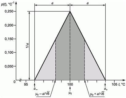 Международная рекомендация МОЗМ Р 12 "Поверка и калибровка образцовых мер твердости по шкале C Роквелла" требует, чтобы максимальная и минимальная глубины вдавливаний, полученные по пяти измерениям на образцовой мере твердости, не отличались более чем на некоторую долю x средней глубины вдавливания, где доля x зависит от показателя твердости. Поэтому можно допустить, что максимальная разность в глубинах вдавливания в разных точках образцовой меры твердости будет xz', где величина z', определенная в H.6.3.2, получена для n = 5. Можно допустить также, что эта максимальная разность описывается треугольным распределением вероятностей вокруг значения (основываясь на предположении, что значения, близкие к центру распределения, более вероятны, чем на его краях - см. 4.3.9). Тогда, принимая в формуле (9b)