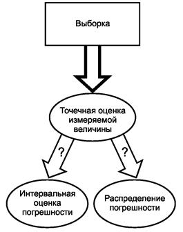 В теории погрешностей использована частотная интерпретация вероятности, наблюдения рассматриваются как выборка из заданной генеральной совокупности, оценки измеряемой величины и характеристик погрешности являются статистиками. В качестве интервальной оценки используется построенный на основе статистик доверительный интервал, соответствующий заданной доверительной вероятности.