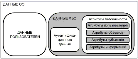 В ОО содержатся данные пользователей и данные ФБО. На рисунке 1 показана их взаимосвязь. Данные пользователей - это информация, содержащаяся в ресурсах ОО, которая может применяться пользователями в соответствии с ФТБ и не предназначена специально для ФБО. Например, содержание сообщения электронной почты является данными пользователя. Данные ФБО - это информация, используемая ФБО для принятия решения в соответствии с ФТБ. Допустимо воздействие пользователей на данные ФБО, если это разрешено ФТБ. Примерами данных ФБО являются атрибуты безопасности, аутентификационные данные, переменные внутреннего состояния ФБО, используемые в соответствии с правилами, определенными в ФТБ, или для защиты ФБО, а также списки управления доступом.