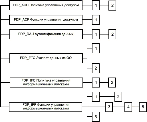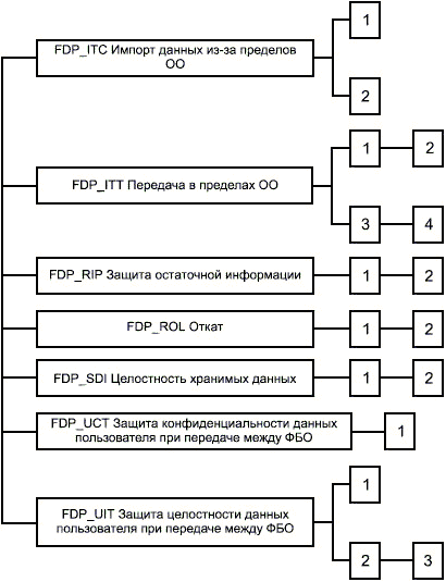 Выделяются ПФБ, которые применяются при защите данных, такие как ПФБ управления доступом и ПФБ управления информационными потоками. Действия механизмов, реализующих ПФБ управления доступом, основаны на атрибутах пользователей, ресурсов, субъектов, объектов, сеансов, данных состояния ФБО и операций в пределах области действия. Эти атрибуты используются в совокупности правил, управляющих операциями, которые субъектам разрешено выполнять на объектах.