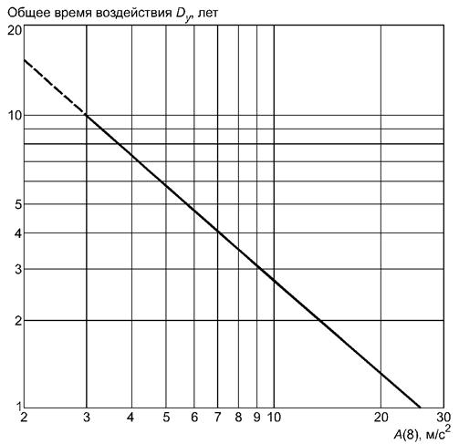 3. Рисунок C.1 и таблица C.1 могут быть использованы для определения критерия вибрационного воздействия с точки зрения опасности причинения вреда здоровью вследствие действия локальной вибрации для профессиональных групп. Значения, указанные в таблице C.1 и на рисунке C.1, получены на основе наблюдений групп рабочих со стажем до 25 лет, применявших ручной инструмент, для которого виброускорение достигало 30 м/с2. Почти во всех таких исследованиях были рассмотрены группы, состоящие из рабочих, которые практически в течение всего рабочего дня использовали инструмент какого-то одного вида или были заняты в одном технологическом процессе, в течение которого вибрация передавалась им на руки. Значения для виброускорения получены по результатам исследований, в которых фиксировали корректированные значения составляющей виброускорения в каком-либо одном, доминирующем направлении действия вибрации.