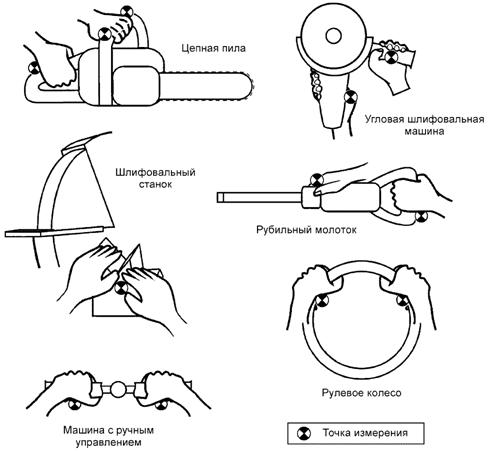 На практике часто наблюдают случаи, когда рука рабочего во время выполнения операции находится в постоянном контакте с ручной машиной или обрабатываемой деталью, но сама машина работает с короткими перерывами. Примером операции такого типа является работа с шлифовальными машинами, цепными пилами, зубильными молотками.
