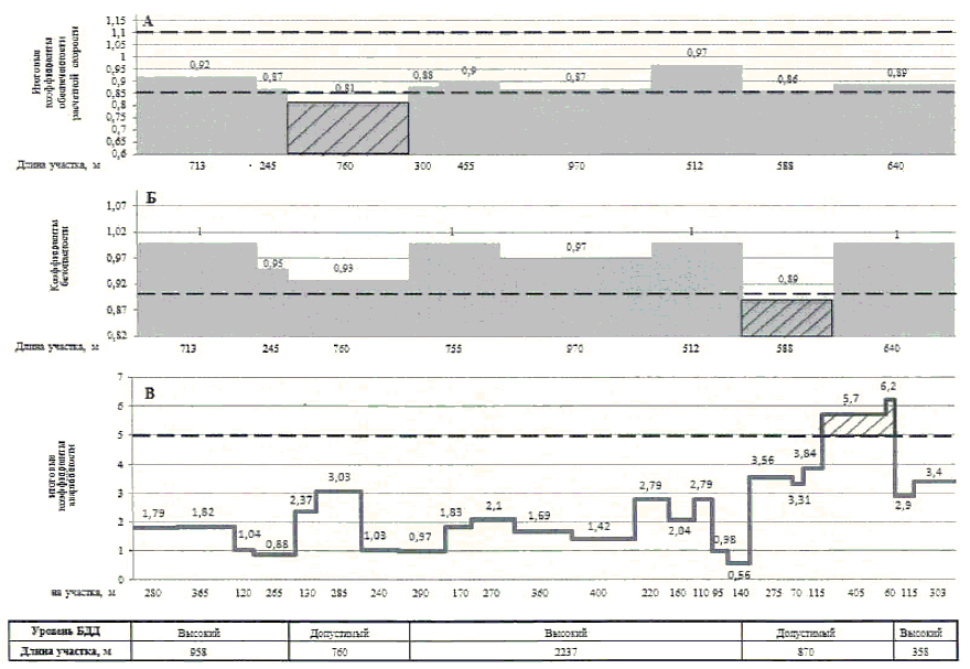 Линейные графики: А - итоговых коэффициентов обеспеченности расчетной скорости; Б - коэффициентов безопасности; В - итоговых коэффициентов аварийности