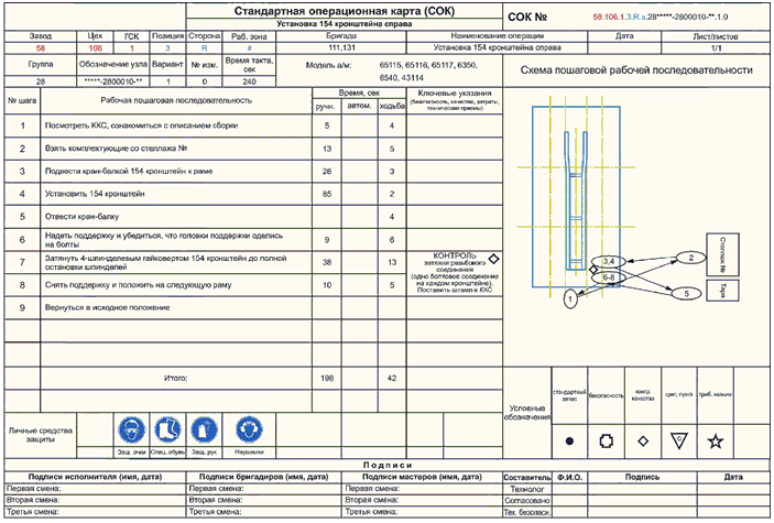 1 Стандартная операционная карта (СОК): Это пошаговое описание последовательности операций на одном листе, включающее в себя требования по безопасности, хронометраж по времени и схему передвижения оператора (спагетти).