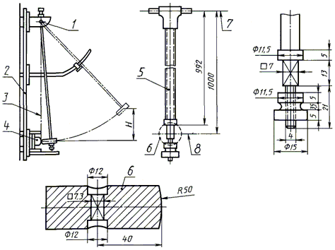 а - метод А: 1 - ось регулируемого колебания; 2 - стойка; 3 - вертикальная плоскость прохождения оси маятника; 4 - образец инструмента; 5 - стальная трубка внешним диаметром 9 мм, внутренним - 8 мм; 6 - молоток; 7 - ось колебания; 8 - ось молотка; H - высота падения молотка.