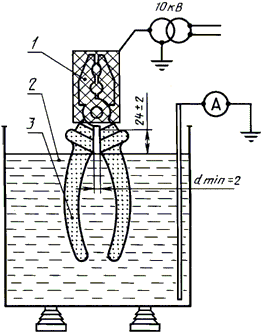 1 - проводящая рабочая часть; 2 - ванночка с водопроводной водой; 3 - изолированная часть инструмента; d - расстояние, которое необходимо поддерживать между внутренними поверхностями рукояток