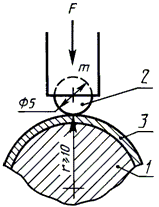 а - радиус прогиба инструмента в точке испытания 10 мм: 1 - проводящая часть; 2 - полусферическая деталь; 3 - изоляция (в испытуемой точке); r - радиус прогиба инструмента в месте испытания; m - масса, воздействующая на инструмент при испытании; б - радиус прогиба инструмента в точке испытания < 10 мм: 1 - проводящая часть; 2 - цилиндрический стержень; 3 - изоляция (в испытуемой точке); r - радиус прогиба инструмента в месте испытания