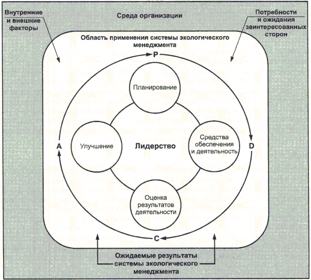 В основу подхода, на котором базируется система экологического менеджмента, положена концепция "Планируй - Делай - Проверяй - Действуй" (Plan, Do, Check and Act) (PDCA). Модель PDCA представляет циклический процесс, применяемый организацией для достижения постоянного улучшения. Модель может применяться к системе экологического менеджмента и к ее отдельным элементам. Модель может быть описана следующим образом: