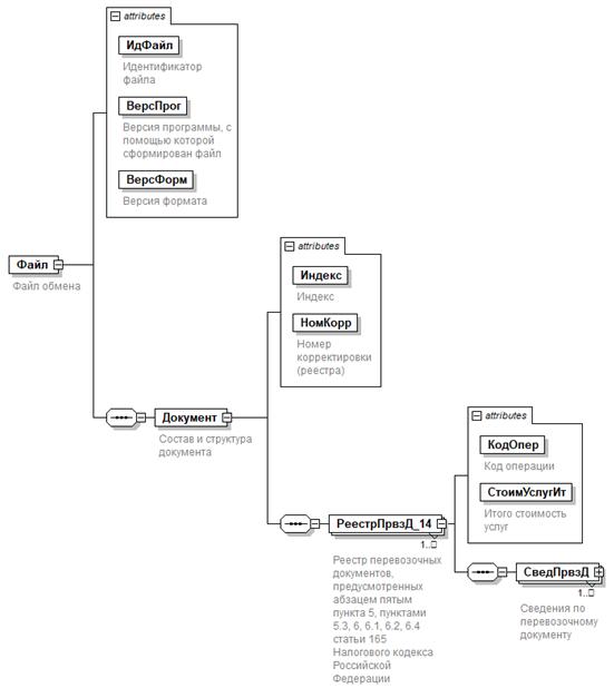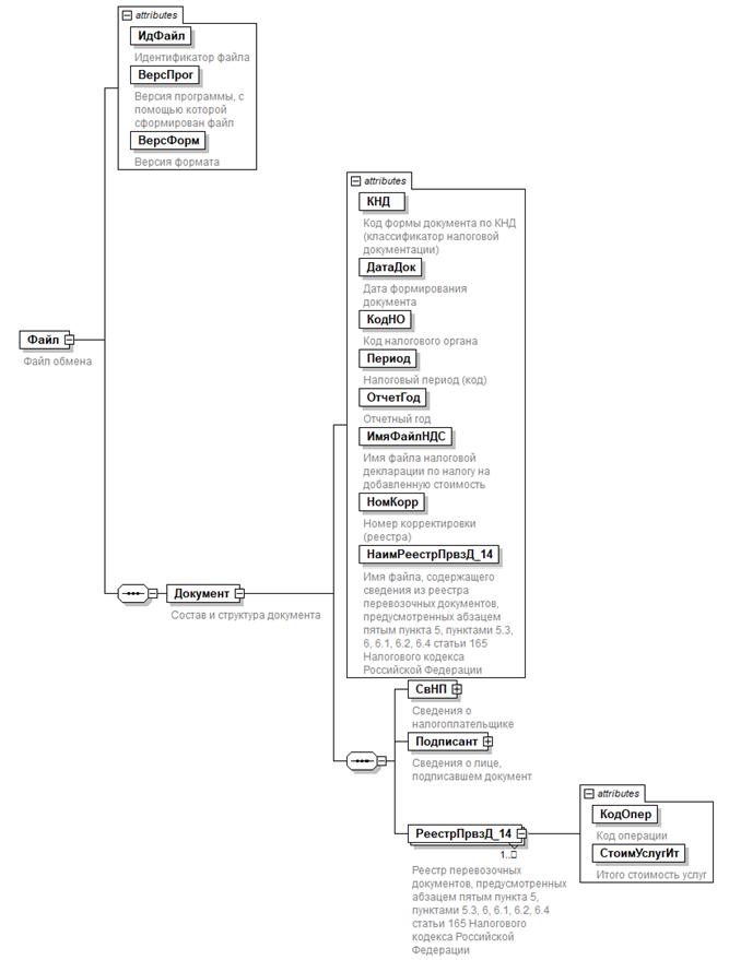 | Реестр перевозочных документов, предусмотренных абзацем пятым пункта 5 и пунктами 5.3, 6, 6.1, 6.2, 6.4 статьи 165 Налогового кодекса Российской Федерации | РеестрПрвзД_14 | С | ОМ | Состав элемента представлен в таблице 5.3 |