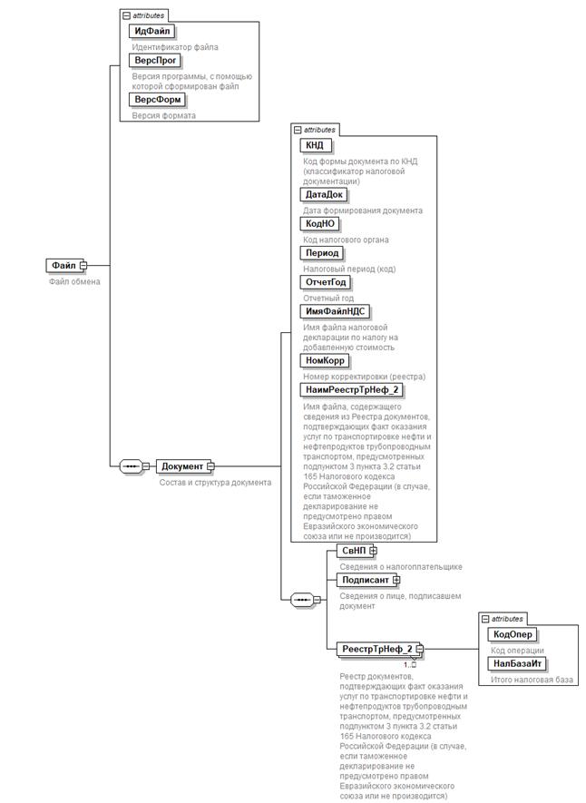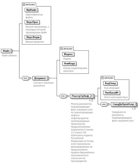 | Реестр документов, подтверждающих факт оказания услуг по транспортировке нефти и нефтепродуктов трубопроводным транспортом, предусмотренных подпунктом 3 пункта 3.2 статьи 165 Налогового кодекса Российской Федерации (в случае, если таможенное декларирование не предусмотрено правом Евразийского экономического союза или не производится) | РеестрТрНеф_2 | С | ОМ | Состав элемента представлен в таблице 5.3 |