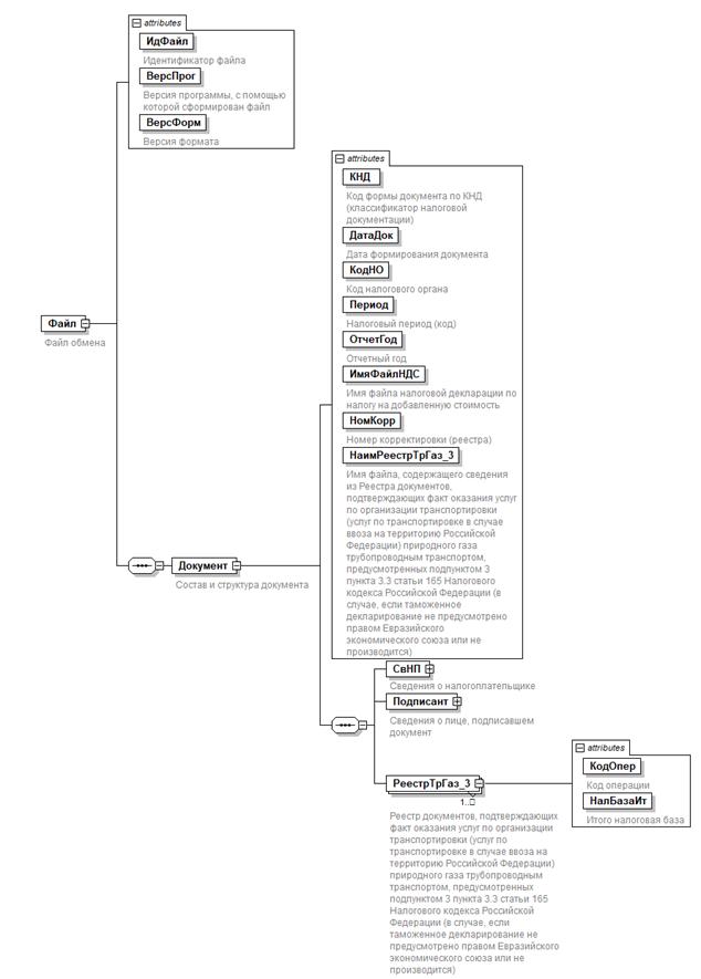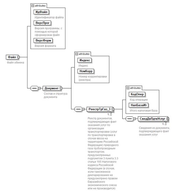 | Реестр документов, подтверждающих факт оказания услуг по организации транспортировки (услуг по транспортировке в случае ввоза на территорию Российской Федерации) природного газа трубопроводным транспортом, предусмотренных подпунктом 3 пункта 3.3 статьи 165 Налогового кодекса Российской Федерации (в случае, если таможенное декларирование не предусмотрено правом Евразийского экономического союза или не производится) | РеестрТрГаз_3 | С | ОМ | Состав элемента представлен в таблице 5.3 |