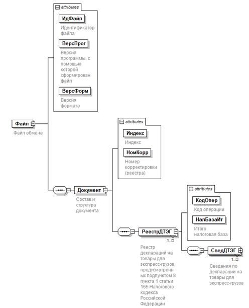 | Имя файла, содержащего сведения из реестра деклараций на товары для экспресс-грузов, предусмотренных подпунктом 8 пункта 1 статьи 165 Налогового кодекса Российской Федерации | НаимРеестрДТЭГ | А | T(1-255) | О | Содержит (повторяет) имя файла (с расширением) с префиксом KO_RRDTEG.2 |