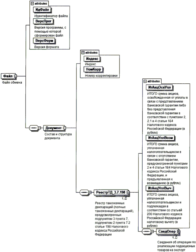 1. Настоящий формат описывает требования к XML файлам (далее - файл обмена) для передачи реестра таможенных деклараций (полных таможенных деклараций), предусмотренных подпунктом 3 пункта 7, подпунктом 2 пункта 7.2 статьи 198 Налогового кодекса Российской Федерации, предоставляемых в подтверждение обоснованности освобождения от уплаты акциза, и возмещения сумм акциза, уплаченных налогоплательщиком в связи с отсутствием банковской гарантии в электронной форме в налоговые органы.