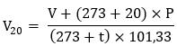 Приведение объема воздуха к стандартным условиям (температура 20 °С и давление 760 мм рт. ст.) проводят по формуле: