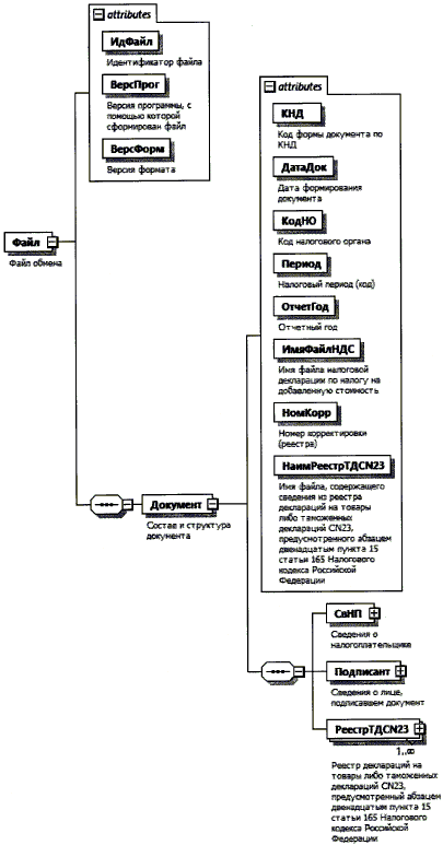 | Реестр деклараций на товары либо таможенных деклараций CN 23, предусмотренный абзацем двенадцатым пункта 15 статьи 165 Налогового кодекса Российской Федерации | РеестрТДСN 23 | С | ОМ | Состав элемента представлен в таблице 3.9 |