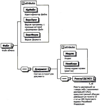 | Реестр деклараций на товары либо таможенных деклараций CN 23, предусмотренный абзацем двенадцатым пункта 15 статьи 165 Налогового кодекса Российской Федерации | РеестрТДСN 23 | С | ОМ | Состав элемента представлен в таблице 5.3 |
