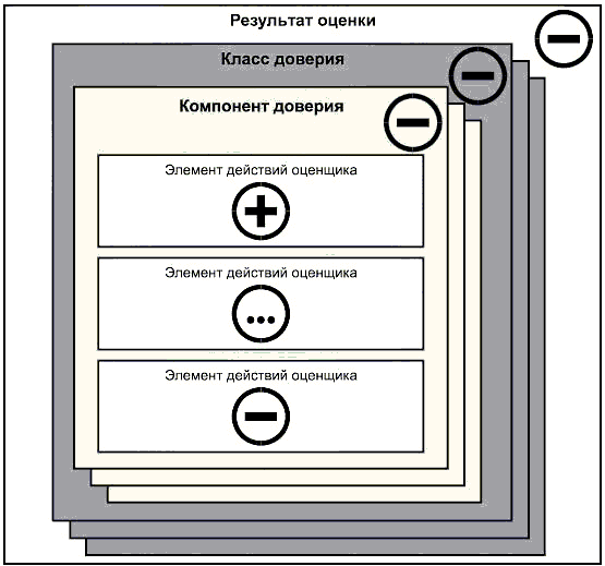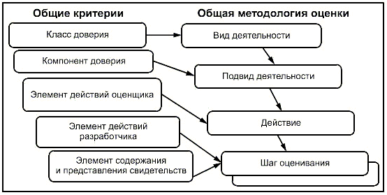 Имеется прямая взаимосвязь между структурой ИСО/МЭК 15408 (класс-семейство-компонент-элемент) и структурой настоящего стандарта. Рисунок 1 иллюстрирует соответствие между такими конструкциями ИСО/МЭК 15408, как классы, компоненты и элементы действий оценщика, и рассматриваемыми в методологии оценки видами деятельности, подвидами деятельности и действиями по оценке. Впрочем, некоторые шаги оценивания из методологии оценки могут следовать из требований ИСО/МЭК 15408, содержащихся в элементах действий разработчика или содержания и представления свидетельств.