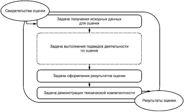 Каждый тип оценки: оценка ПЗ или оценка ОО (в том числе оценка ЗБ) проводится в рамках единого процесса и включает четыре общие задачи для оценщика: задачу получения исходных данных для оценки, задачу оформления результатов оценки, задачу выполнения подвидов деятельности по оценке и задачу демонстрации технической компетентности органу по оценке.