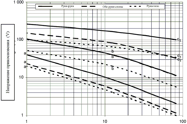 Примечание. Пути тока через тело человека и сопротивление приведены в приложении A МЭК/ТО 60479-5. Минимальные значения напряжения прикосновения, определенные для пути тока "обе руки к ступне", как правило, считаются более жесткими по сравнению с путем тока "от двух рук к двум ступням".
