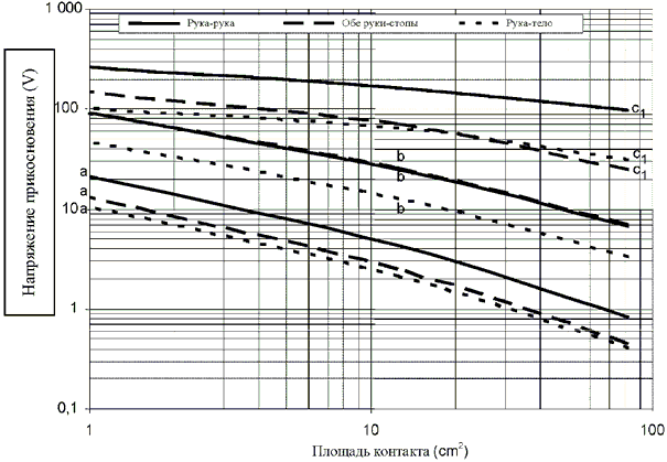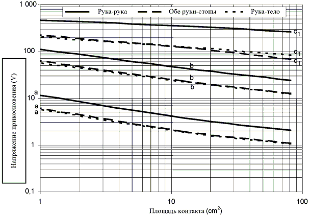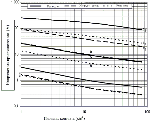 При выборе допустимых напряжений прикосновения в соответствии с настоящим стандартом для снижения риска поражения электрическим током следует принять меры уменьшения максимально допустимой площади контакта.