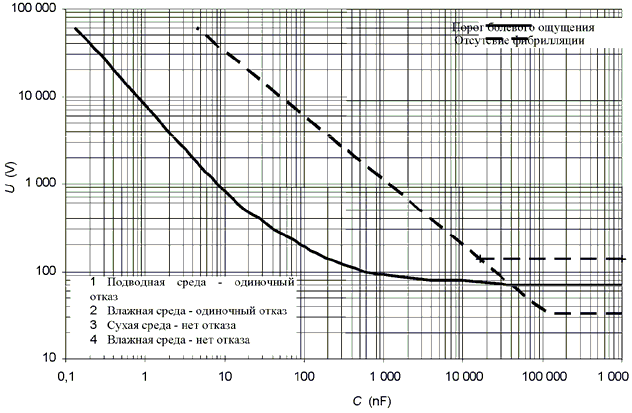 На рисунке А.1 приведены ограничения для напряжений на доступных прикосновению заряженных конденсаторах при различных значениях емкости. Нижние значения напряжений 1, 2, 3 и 4 представляют установившиеся значения допустимых напряжений, приведенных в таблице А.1.