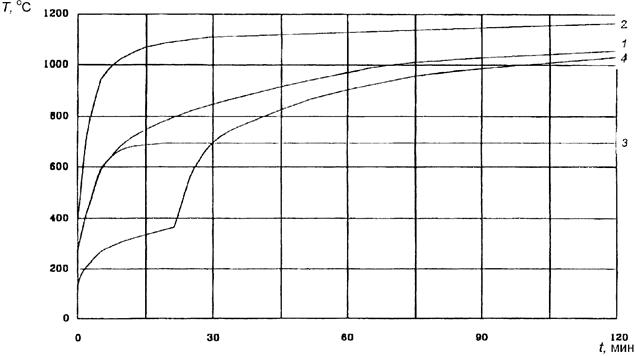 1 - стандартный температурный режим; 2 - углеводородный температурный режим; 3 - наружный температурный режим; 4 - медленно развивающийся (тлеющий) температурный режим